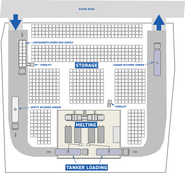 The CPU is ideally positioned near the bitumen production plant and can be supplied by a pipeline or tankers. It is a compact semi-automatic process plant that does not require much space and can be placed in the vicinity of the bitumen production facility (or even within the premises as an add-on).