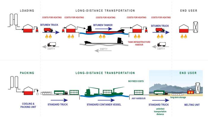 Furthermore, with PBPS, Bitumen can be stored at virtually no cost. Huge investments in terminals and storage infrastructure become obsolete.