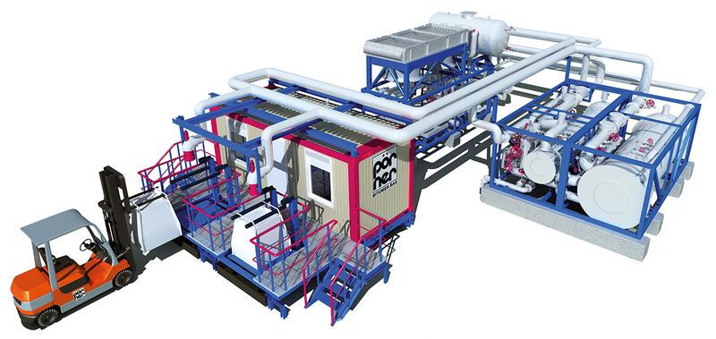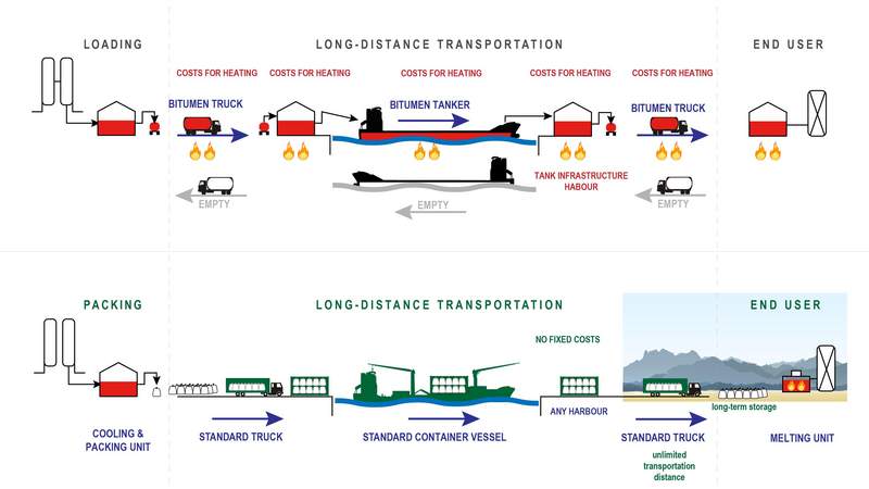 The Pörner Bitumen Packing System (PBPS) is a comprehensive cold bitumen logistic/supply chain solution from A to Z for the bitumen industry. It addresses all aspects of the bitumen producer, the logistics, the distributor and the end-user.