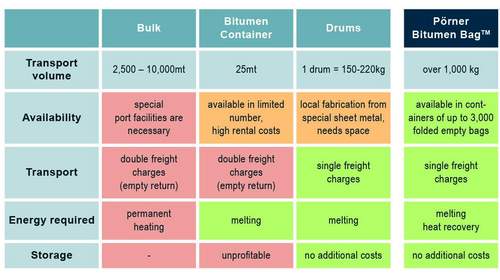 The patented innovative Pörner Bitumen Bag™ is a self-stabilizing container made of plastic material, consisting of a multi-layer outer bag (recyclable) and an inner liner special-purpose film. The liner is melted together with the bitumen without changing its quality properties. The latest generation of bags includes a simple frame structure for extra stabilization to accommodate the larger mass.
