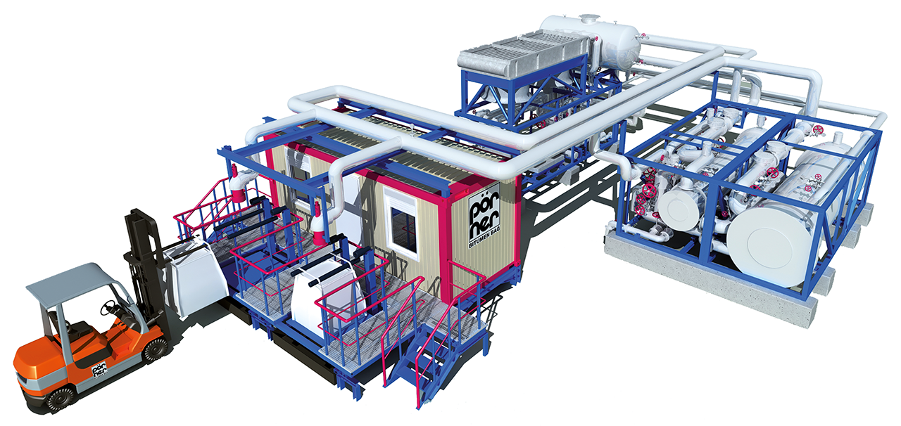 At the end of the supply chain, the bitumen has to be re-liquefied for final application. This is accomplished by the Pörner High-Performance Melting Unit (HPM), which is the central element of a Melting Terminal.